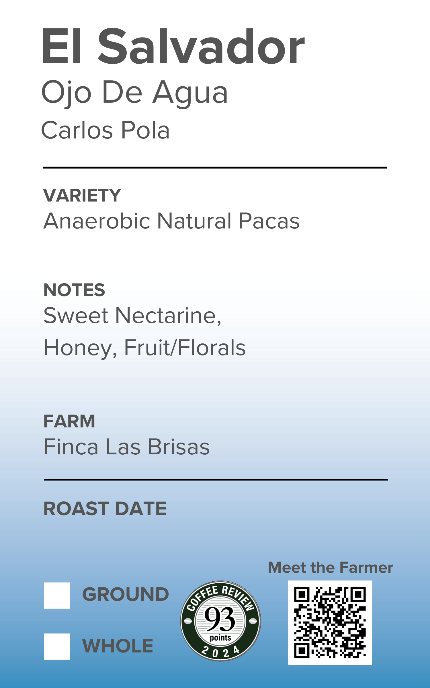 Now in our 4th season with Carlos Pola, we’re excited to share a delicate Anaerobic from Ojo De Agua. More subtle than most anaerobics, it balances vibrant fruit and floral notes with a sweet, smooth body. Carefully handpicked, fermented 72 hours without oxygen, then dried on raised beds, this cup delivers one of the year’s finest expressions—bright, layered, and unforgettable.